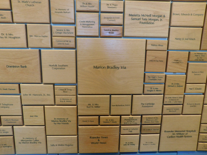 A wall of tiles with the names of some of the donors to the Bradley Free Clinic