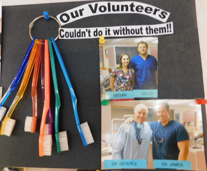 A bulletin board showing the names of some the dental professionals that work at the Bradley Free Clinic