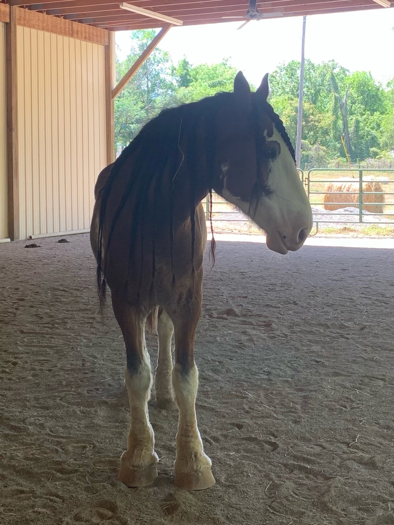 A friendly therapy horse resembles a small Clydesdale and could probably