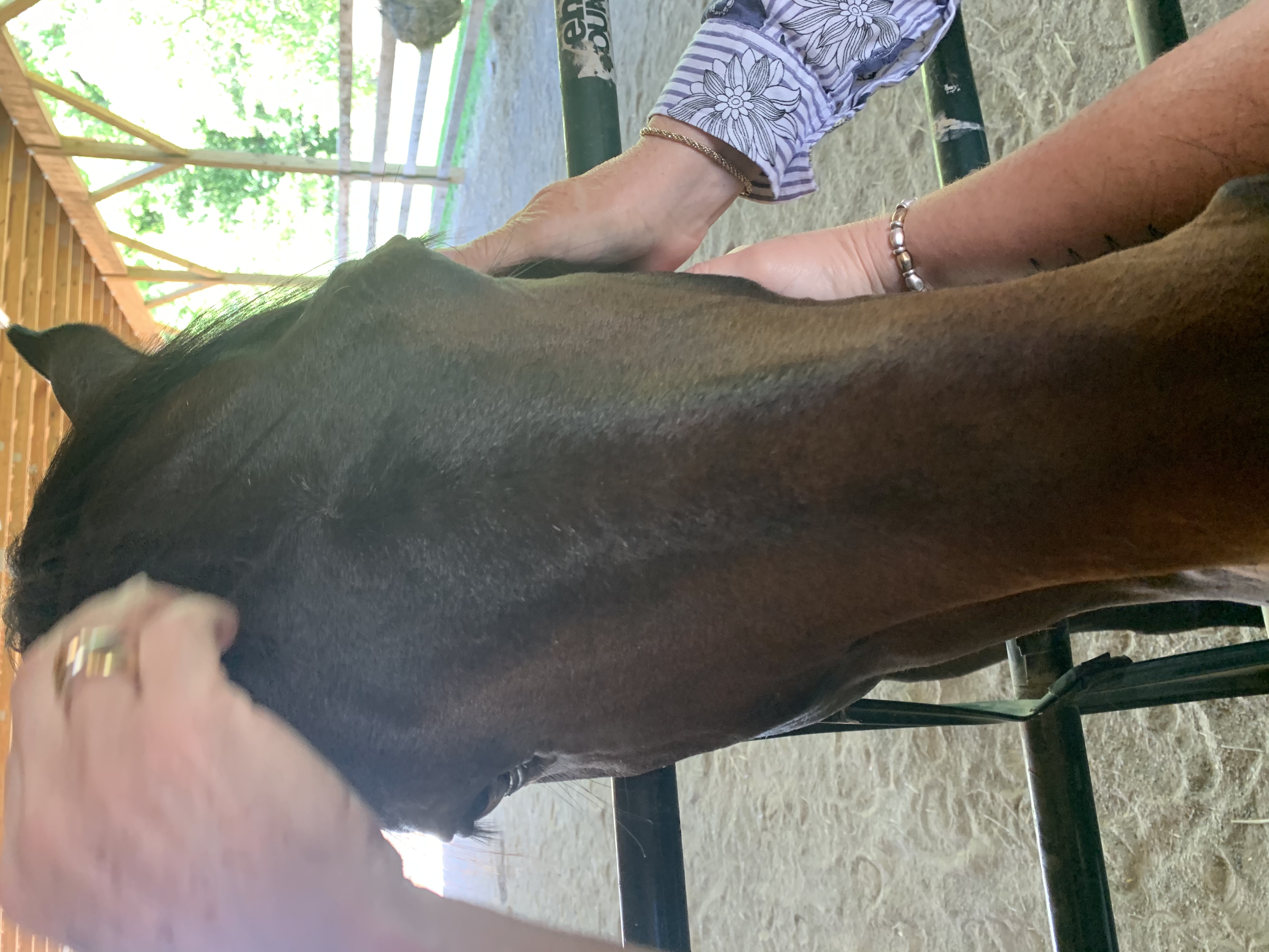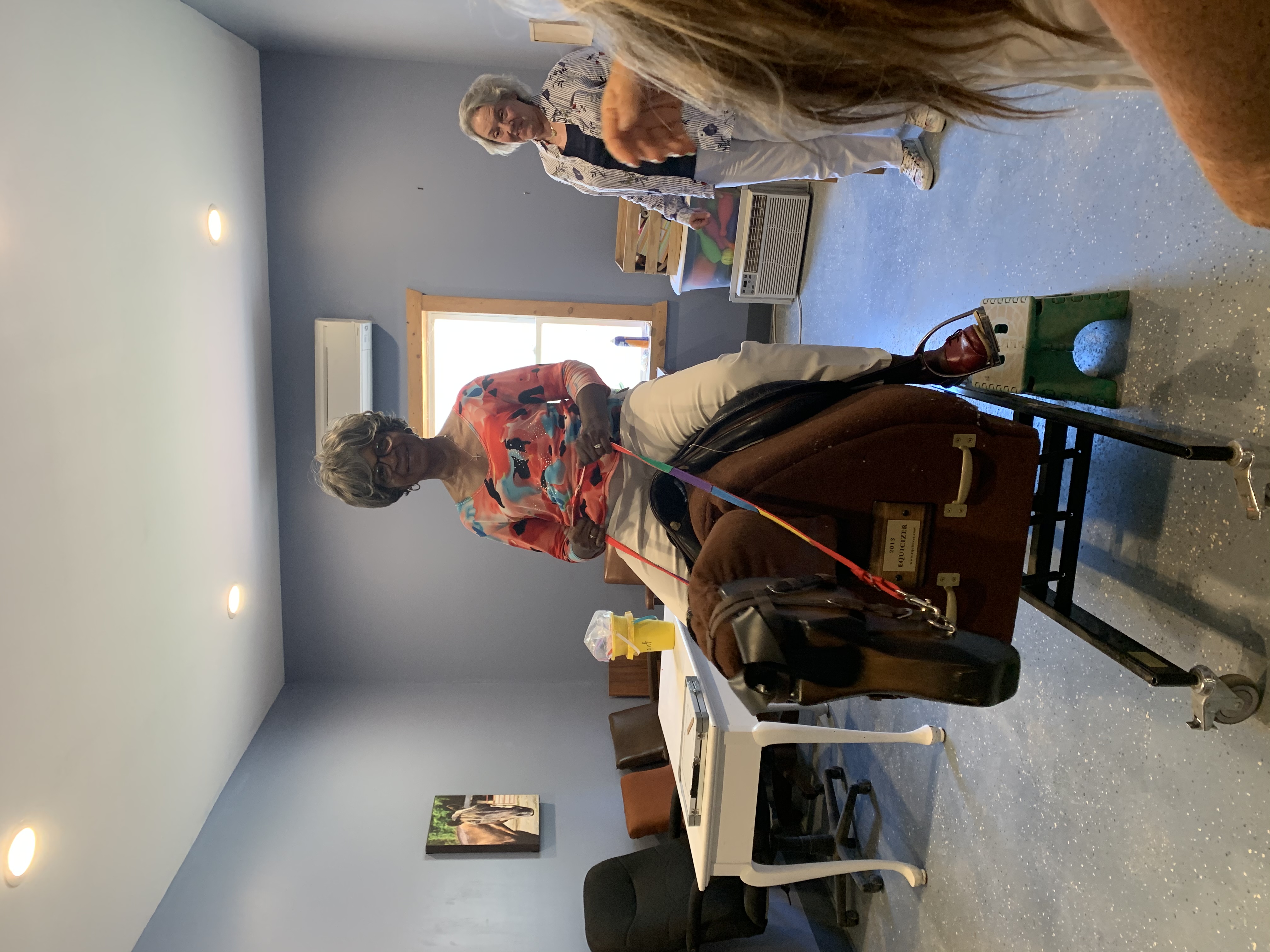 Douglas Powell(c) awaits her turn on the mechanical therapy horse