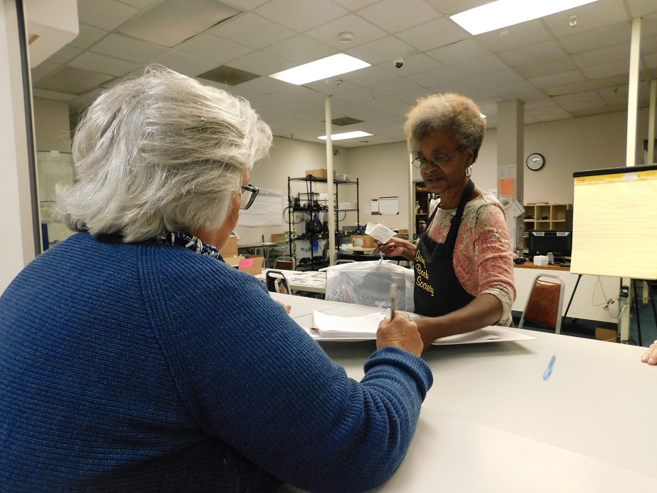 Donna Henderson (r) answers a question about the Belk Charity Day sale while selling a ticket
